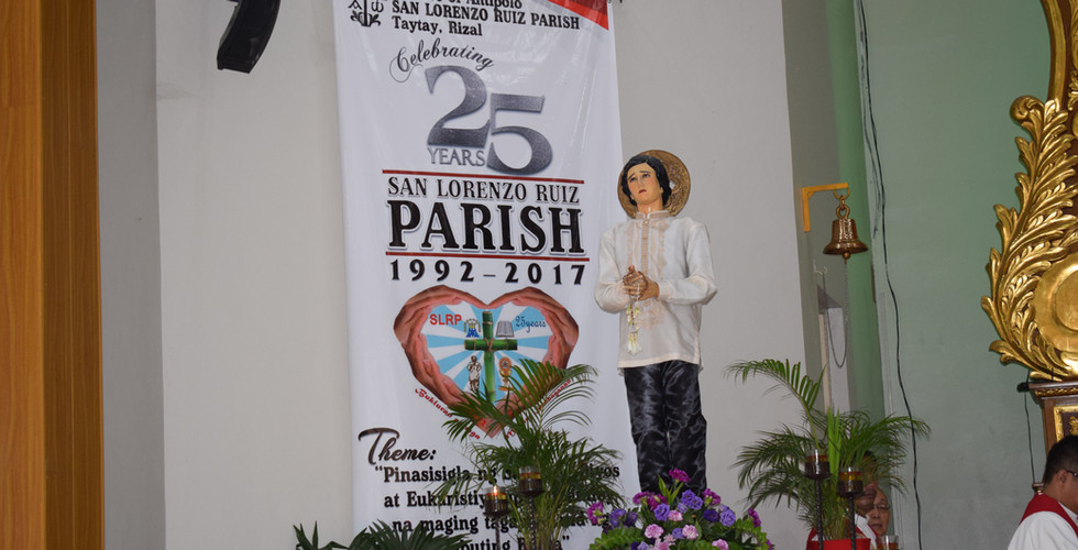 Taytay: San Lorenzo Ruiz Parish celebrated its twenty fifth (25) year anniversary last September 28, 2017, during its Feast day. The 'fiesta' started with a procession of various patron Saints from different chapels together with the image of San Lorenzo. It was around eight (8:00) in the morning that they had started the celebration and followed by the Holy Eucharist at Ten (10:00 am). The Holy Eucharist was presided by His Excellency Bishop Francisco De Leon, DD bishop of Antipolo. It was participated by Religious, Diocesan priests and parishioners of San Lorenzo Ruiz.